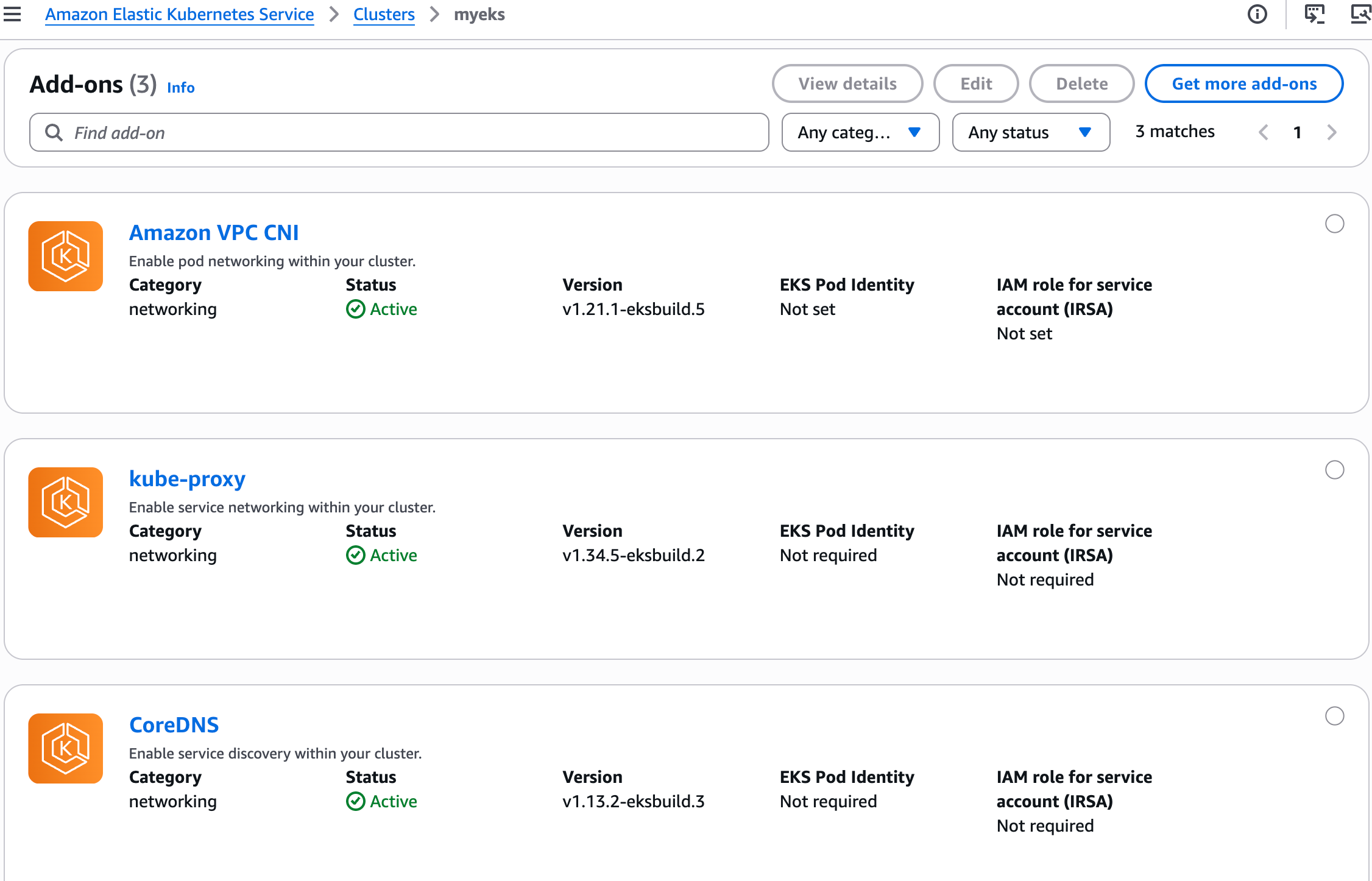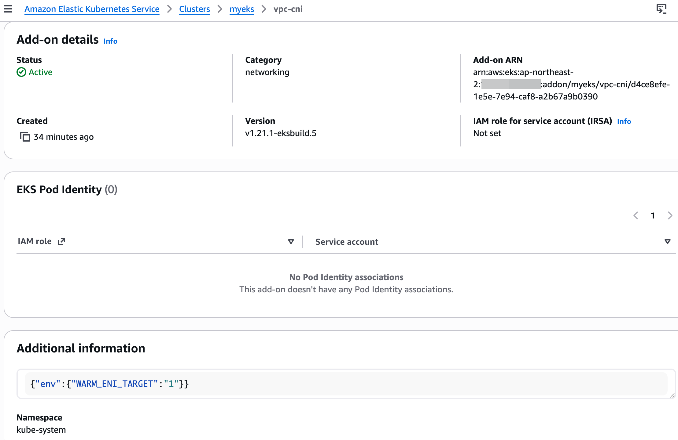 - Add-ons 추가 기능 : VPC CNI 클릭 후 추가 정보 확인