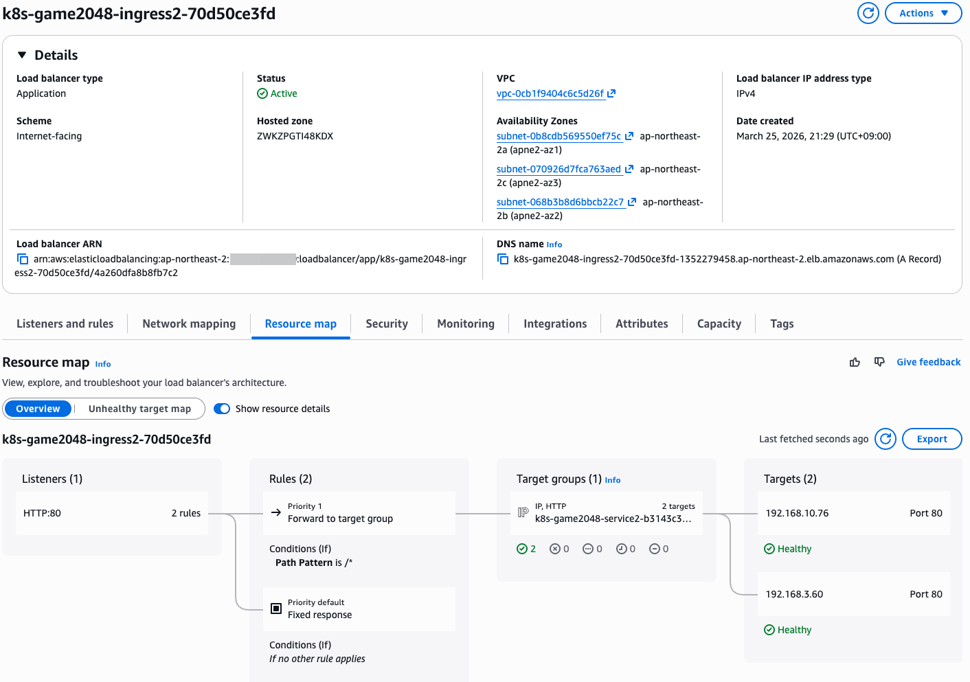 {"level":"info","ts":"2026-03-25T14:26:40Z","logger":"controllers.gateway.k8s.aws/alb","msg":"created loadBalancer","stackID":"default/alb-http","resourceID":"LoadBalancer","arn":"arn:aws:elasticloadbalancing:ap-northeast-2:143649248460:loadbalancer/app/k8s-default-albhttp-bc3439871e/d0665c603e6ccfa3"}